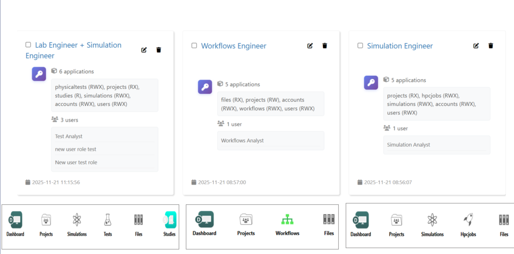 Roles in d3VIEW can contain multiple applications and their associated permissions. When an admin assigns a role to a user during role creation or editing, the user gets access to those applications according to the given permissions. On the Roles home page, admins can quickly see the number of applications and the number of users associated with each role which will be easier to understand the role configuration.